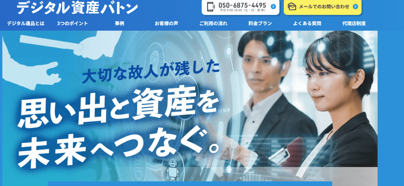 デジタル資産バトンは、故人が残したデジタル遺品(パソコン、スマートフォン、SNSアカウント、クラウドストレージなど)を整理し、必要な情報を遺族に提供するサービスです。
