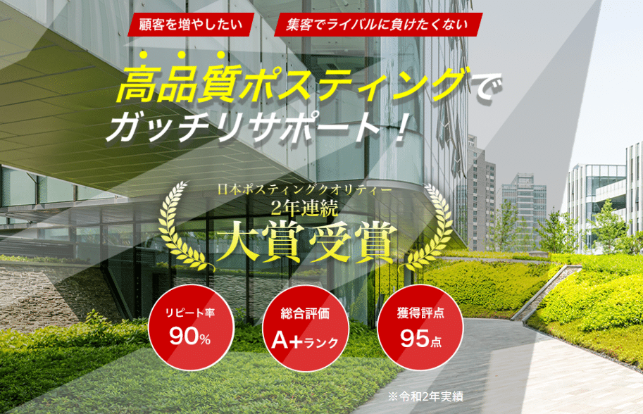 公式サイトでは、日本ポスティングクオリティー大賞 2年連続受賞、リピート率90%・総合評価A+・評点95(令和2年実績)などの指標が提示されています。