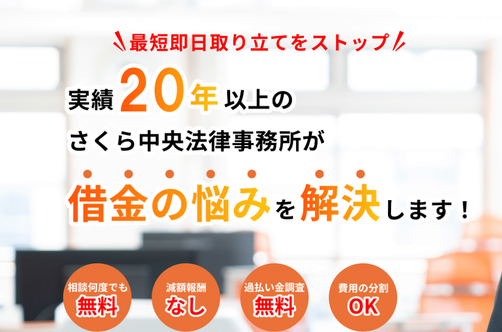 「督促が止まらない」「返しても返しても減らない」——そんな不安を最短即日でストップし、あなたの状況に合わせて任意整理・個人再生・自己破産の中から最適解を提示するのが、さくら中央法律事務所。
