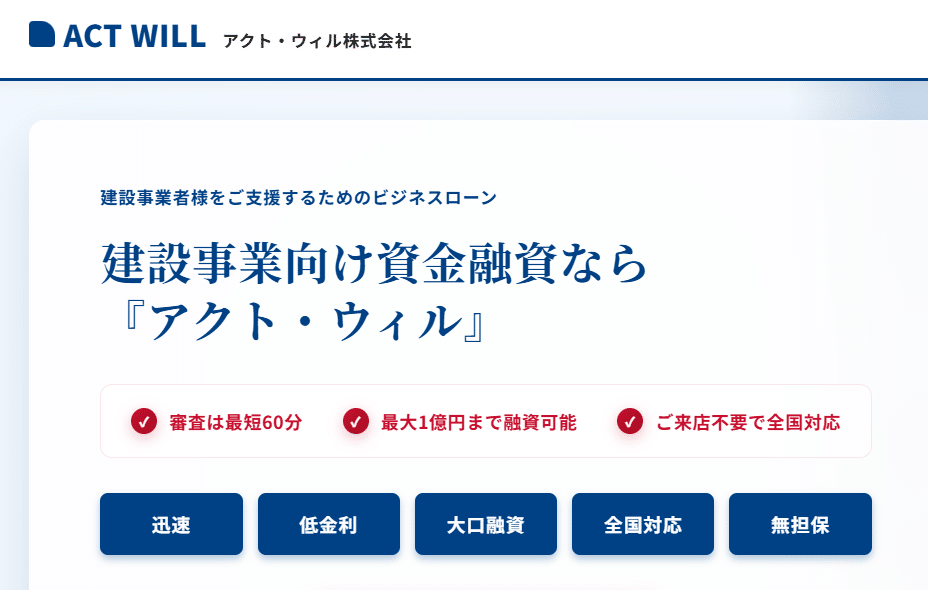 アクト・ウィル株式会社は、最短60分審査・即日融資対応を特徴とする法人向けの事業資金融資サービスです。建設業向けの案内が用意されており、工事代金の入金遅れや支払い先行など、業界特有の資金繰り課題に対応しやすい点が魅力です。