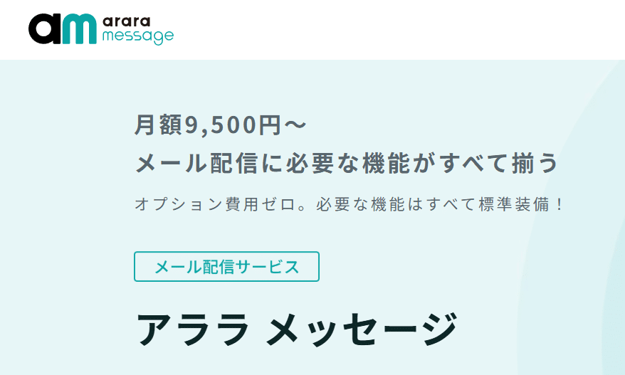 アララ メッセージは、月額9,500円〜、最短1か月から契約可能で、HTMLメール作成、効果測定、API配信など、メール配信に必要な機能を標準搭載している点が特徴です。公式サイトでは、登録アドレス数無制限や追加費用なしの機能提供も案内されています。