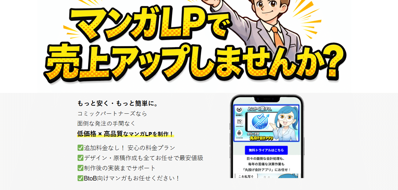 コミックパートナーズは、マンガLPを使って伝わりにくい商材を分かりやすく見せたい企業にとって、有力な検討候補の一つです。公式サイトでは、原稿作成からデザイン、作画、実装まで一括で対応しやすいこと、BtoB商材にも向いていること、料金や納期の目安が見えることなどが示されています。こうした点は、依頼前の安心感につながります。