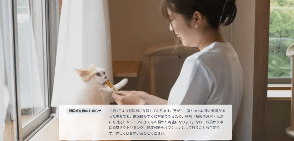 獣医師監修、写真・動画報告など、猫と飼い主に寄り添ったサービスが高く評価されています。