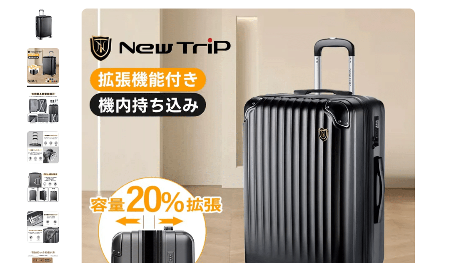 New Tripは、スーツケースを中心に旅行用品を展開しているトラベルグッズ専門店で、サイズや機能の選択肢が広く、旅行スタイルに合わせて商品を探しやすいのが魅力です。参考URLの0201モデルでは、軽量設計、拡張機能、TSAロックなど、旅行者にうれしい機能がまとめられており、さらに商品ページ上ではセール価格7,160円と表示されていました。