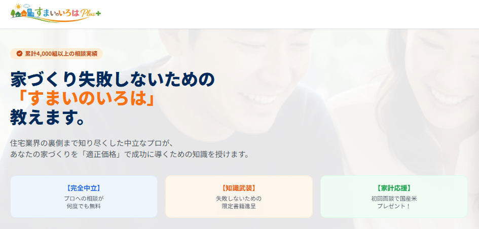 すまいのいろはPlusは、埼玉・東京・神奈川を中心に、注文住宅や土地探し、ライフプランまで相談できる無料の住まい相談サービスです。公式サイトでは「累計4,000組以上の相談実績」「完全中立」「何度でも無料相談」といった強みが打ち出されています。いっぽうで、ネット上の独立した口コミはまだ多くなく、判断材料は公式情報と一部の紹介記事が中心でした。