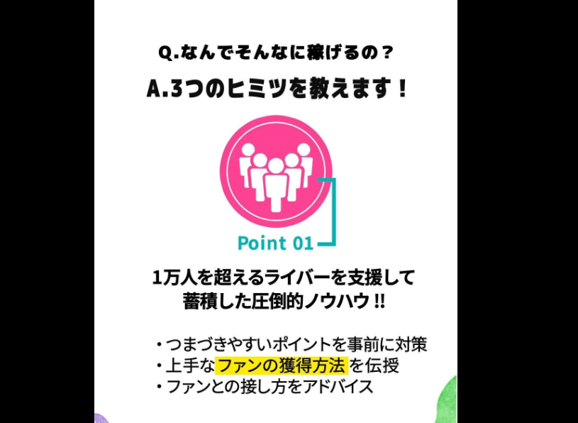 A. 面談予約→ガイダンス→配信準備の流れで、未経験スタートを前提とした導線が用意されています。必要な機材・台本づくり・初配信のコツなどは面談で確認しましょう。